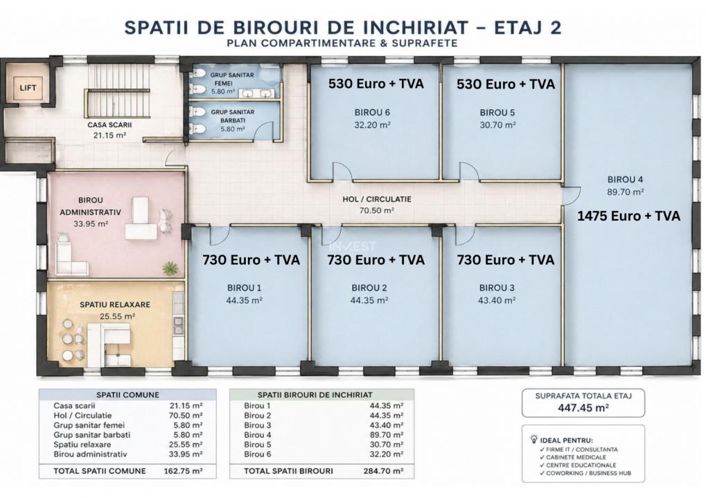Agenția Invest Imobiliare oferă spre închiriere 9 spații de birouri într-o clădire renovată complet (2026), cu lift, situată în Galata – vis-a-vis de Penny Market, lângă Spitalul de Recuperare și Lidl, IASI.